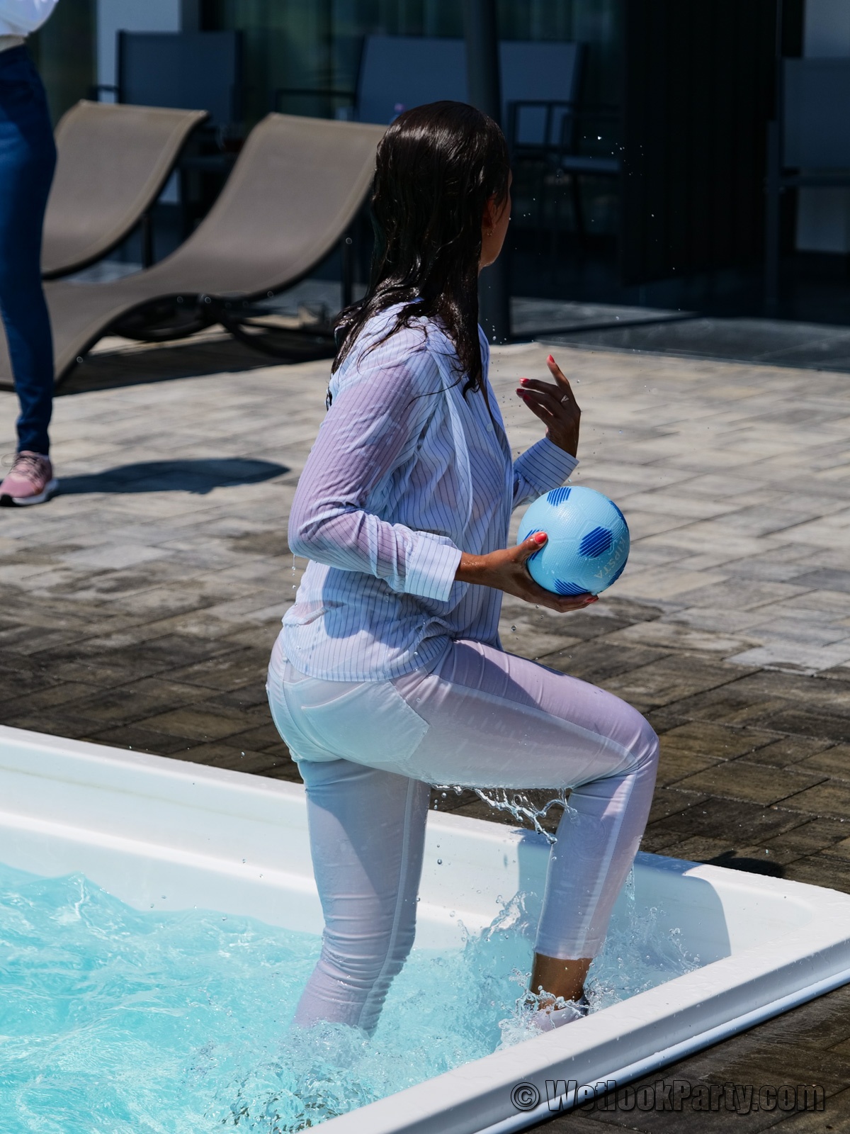 Lara is back in the pool for a new set of challenges. This time, she is dressed in a casual white set.