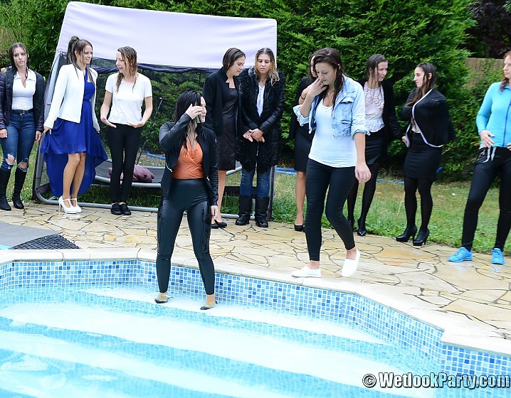 In the first part, all the girls soak their clothes a little under the shower and three of them jump into the pool with their black dresses and heels on of course.