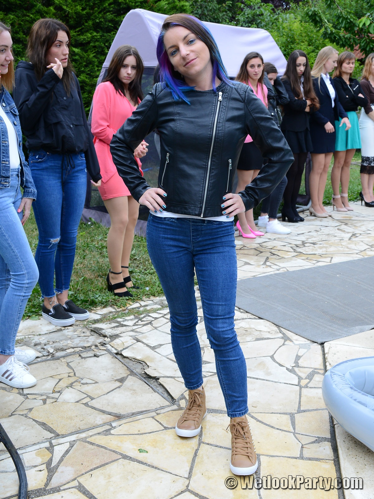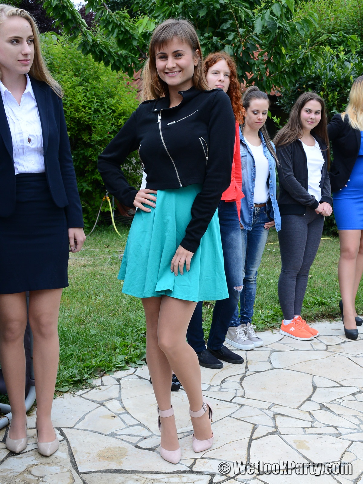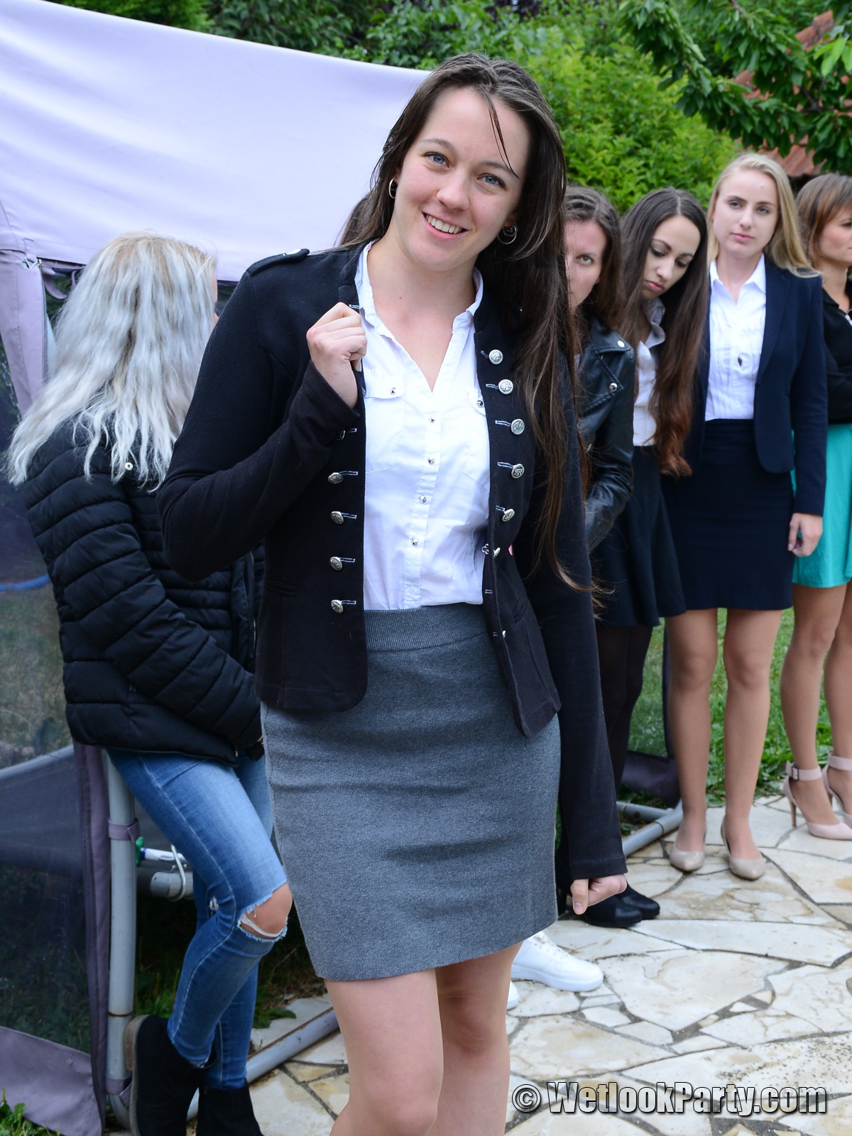 So, what we have here... 19 girls, all dressed up in their own clothes, all of them could choose the clothes they want to get wet into and all of them will have fun in this one.