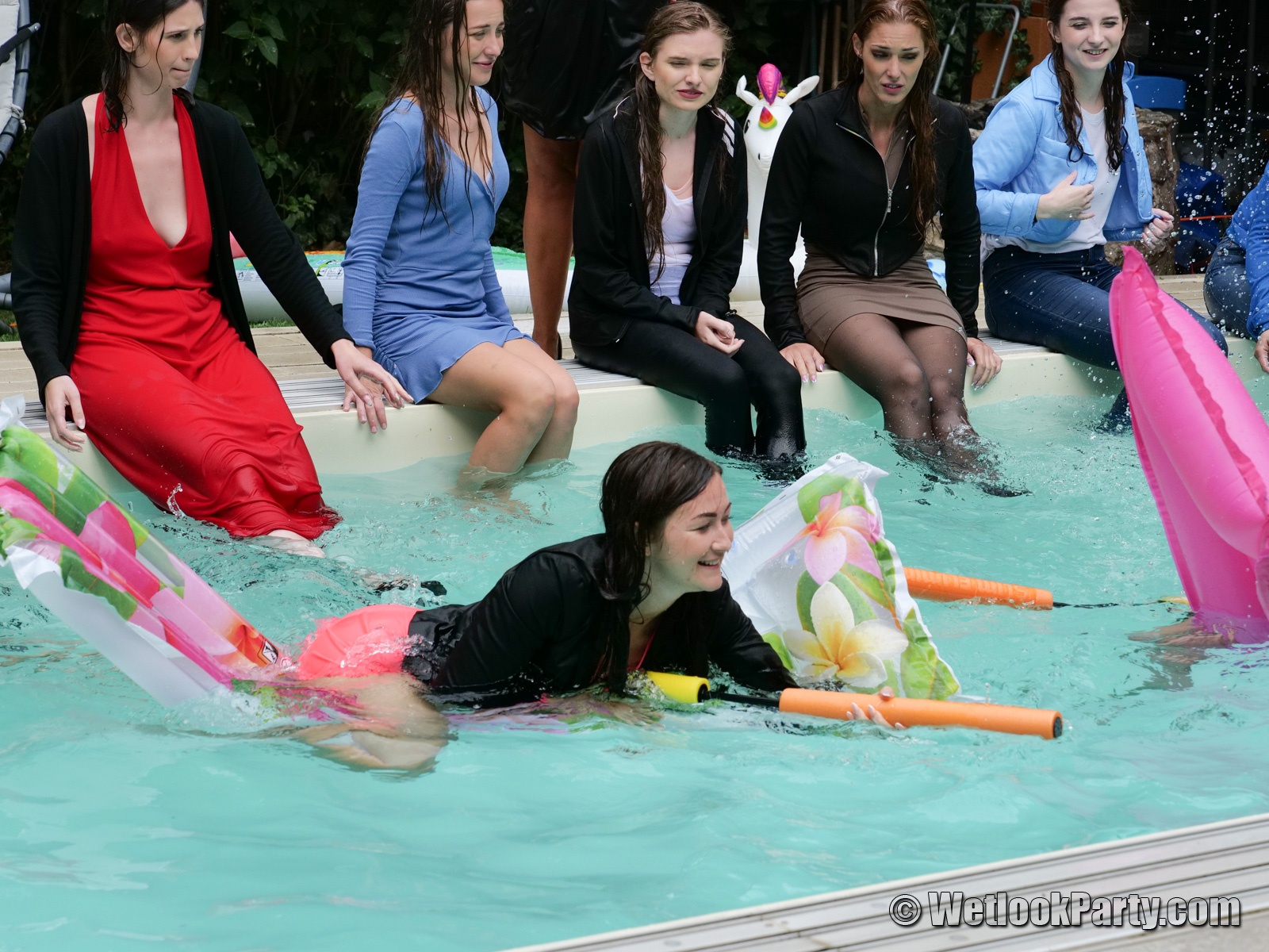 After all the girls had completed the challenge, Lara told them about the new stage of the party: the Mattress fight. The task was simple: We grouped the girls in pairs, and they had to push one another in the water. The winner was the one who remained the most time on the mattress. The rest of the girls had to splash them with their feet, so there was water mayhem in this one.